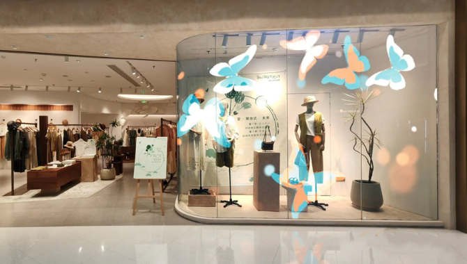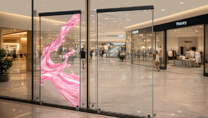 Transparency typically reaches 90%, allowing clear visibility of products and interior spaces behind the screen while displaying dynamic digital content.